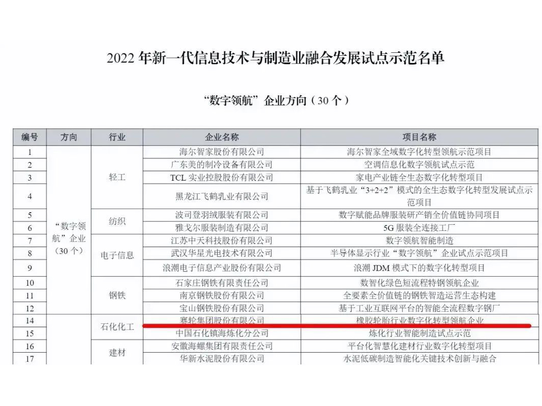 10月31日,工業(yè)和信息化部網(wǎng)站公示了2022年新一代信息技術與制造業(yè)融合發(fā)展試點示范名單,在本次試點示范中,工信部首次提出了“數(shù)字領航”企業(yè)方向。本次公布的首批30家數(shù)字領航企業(yè)中,賽輪集團是橡膠輪胎行業(yè)唯一入圍企業(yè)。